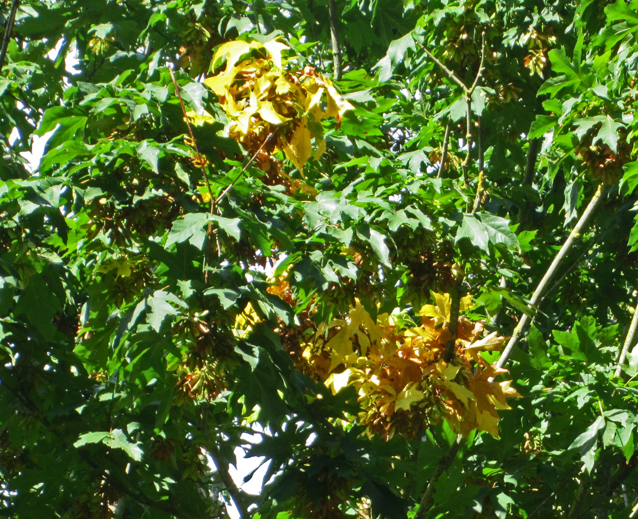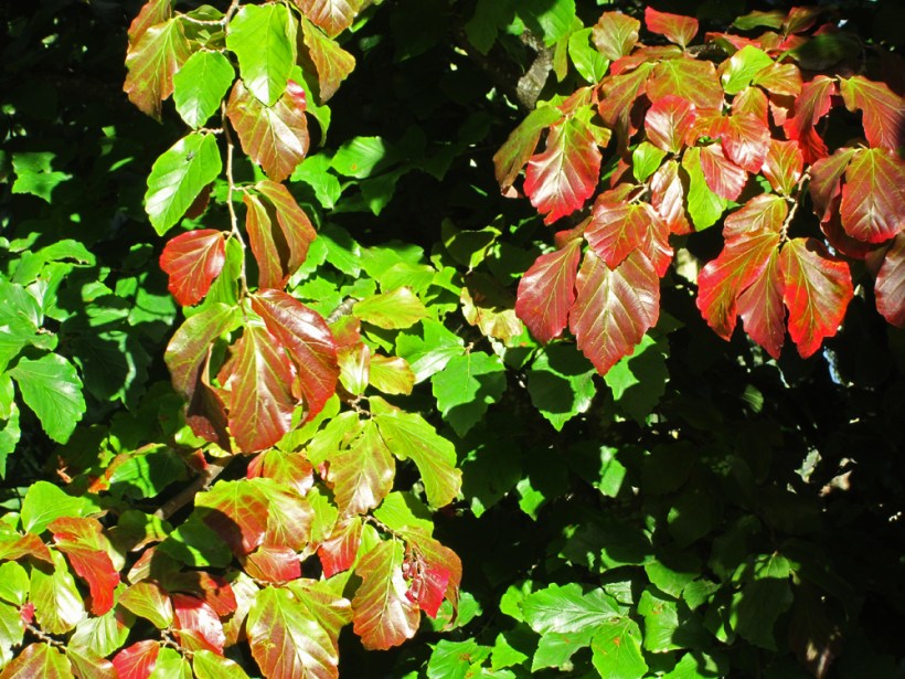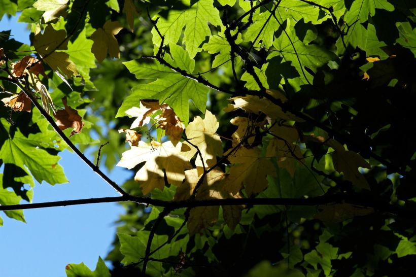 I sympathize with the not-so-fresh foliage on the farm in late summer. In anticipation of autumn, some of the yellow leaves simply give up and let go, flying in the wind to their final resting place, even in early September.  Others decide to hang on until the bitter end ~yellowing, goldening, reddening and browning in a shimmering kaleidoscope of exhausted pigment.