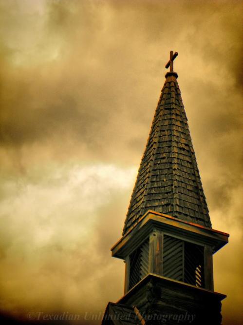 photo by Kim Rockdale of St. Anne’s Church steeple, Parksville, Vancouver Island