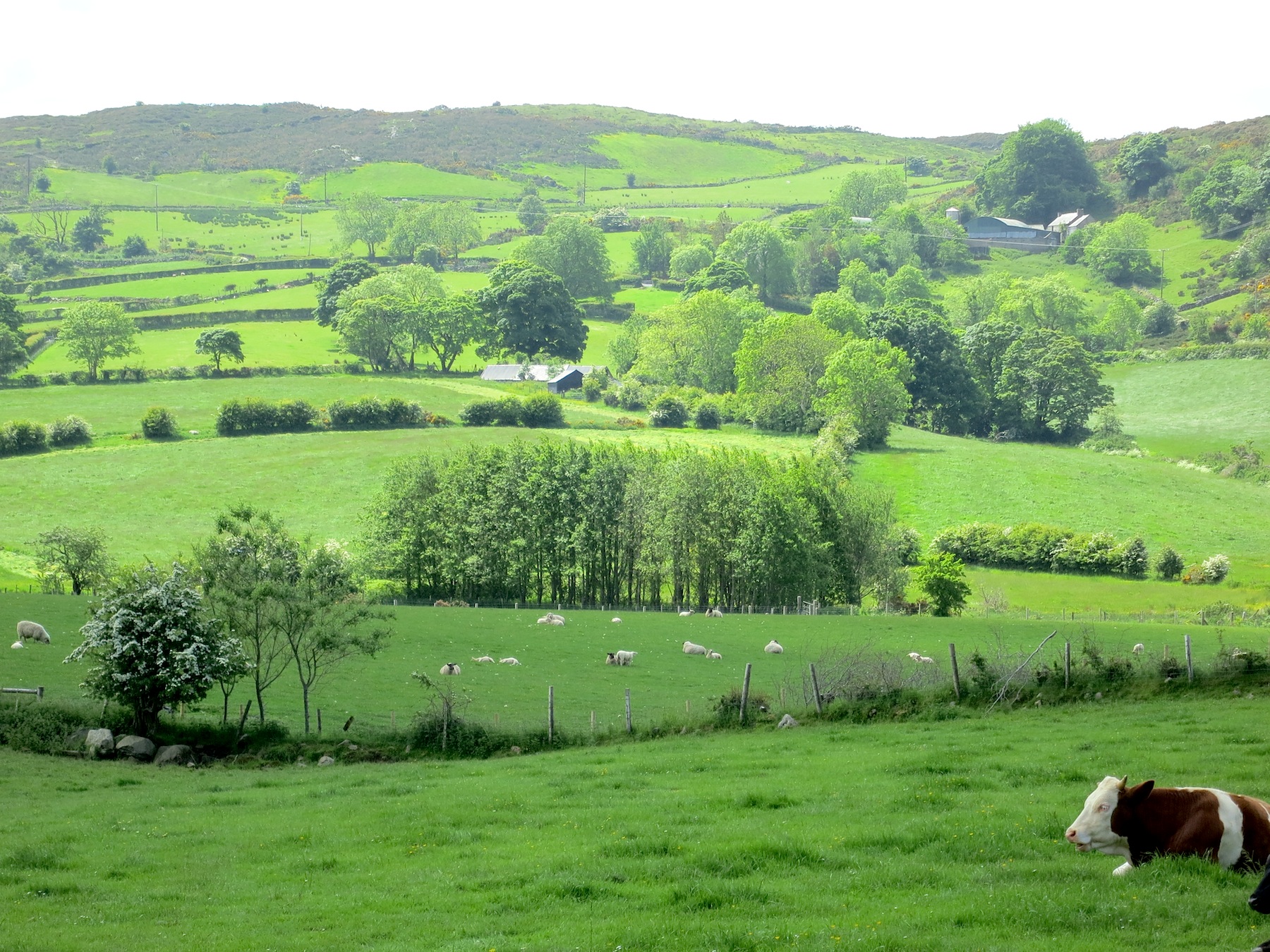 We climbed the highest hill in this area, Slieve Croob, yesterday, watching the storm clouds blow past beneath and over us, winds up to 50-60 mph on top, with spots of brightest sun illuminating the brightest greens.  Life is good, even if wet.  Life is even better because of the green arms embracing us.