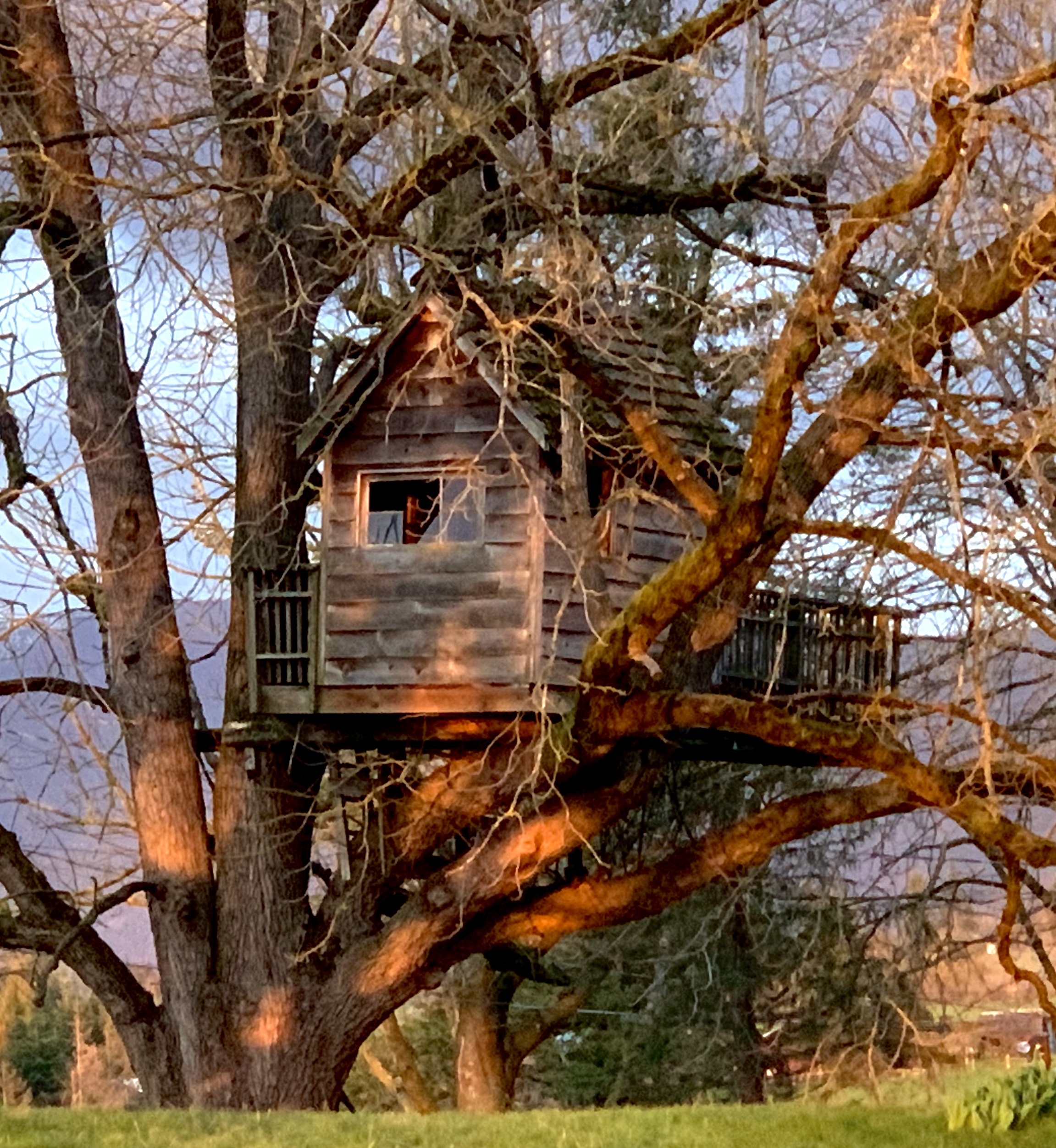 My father’s treehouse is twenty five years old this summer, lonesome and empty in our front yard, a constant reminder of his own abandoned Swiss Family Robinson dreams. Over the years, it has been the setting for a local children’s TV show, laser tag wars, sleep overs and tea parties, even my writer’s retreat with a deck side view of the Cascades to the east, the Canadian Coastal Range to the north and Puget Sound to the west. Now it is a sad shell no longer considered safe, as the support branches in our 100+ year old walnut tree are weakening with age and time. It is on our list of farm restoration projects, but other falling down buildings must be prioritized first.