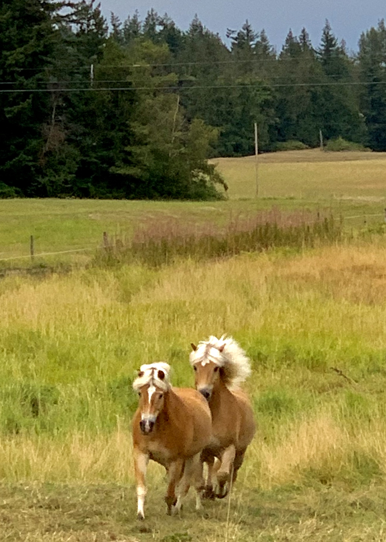 When Haflingers gallop in the field, it sounds like thunder as their hooves pound the earth. It can be a particularly ominous sound, especially in the middle of the night when the pounding hooves are going past our bedroom window which means only one thing: their field gate or the barn door has been breached. Haflingers are also Houdinis.