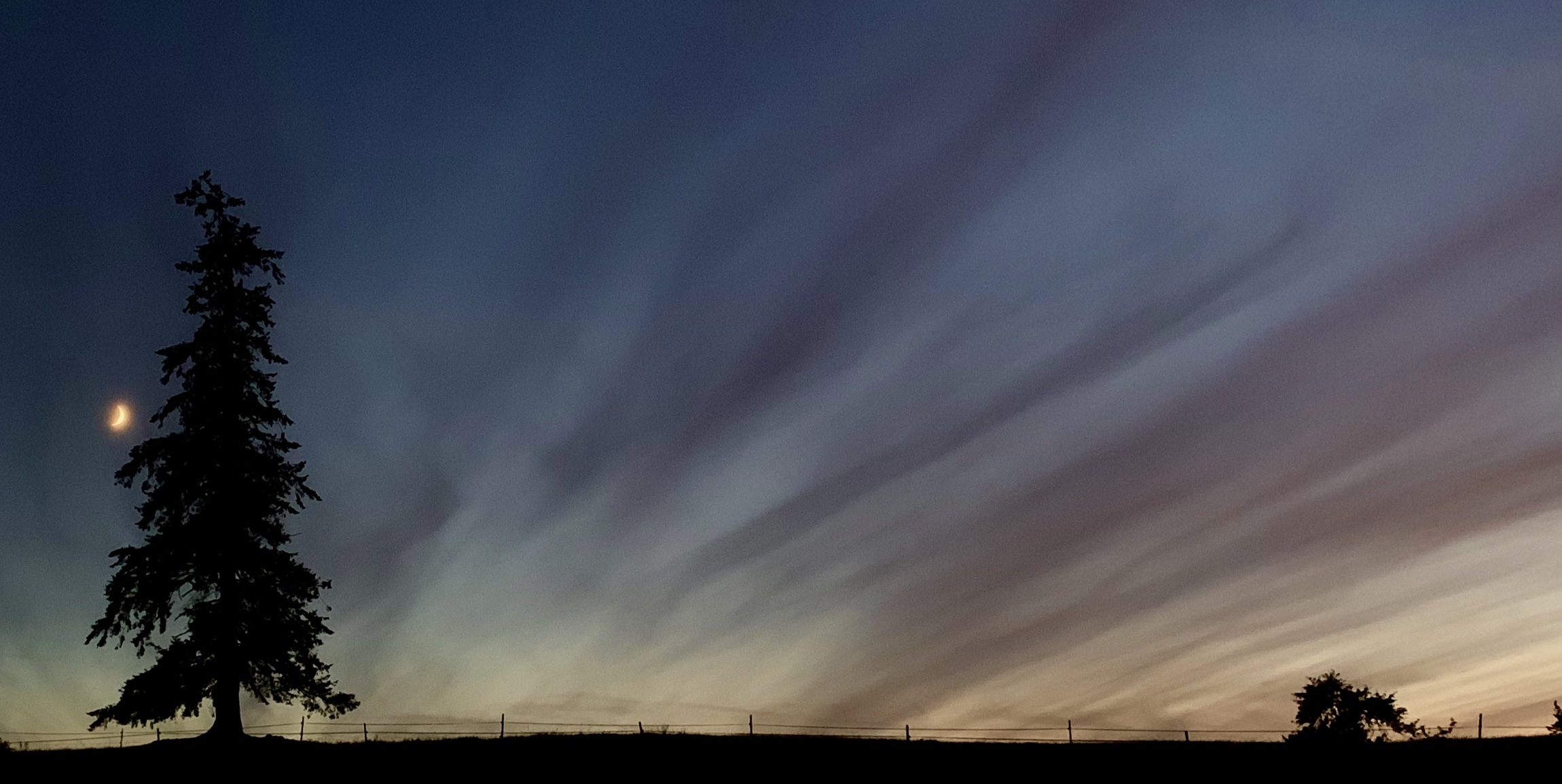 A thin comma moon rises orange, a skinny slice of melon,