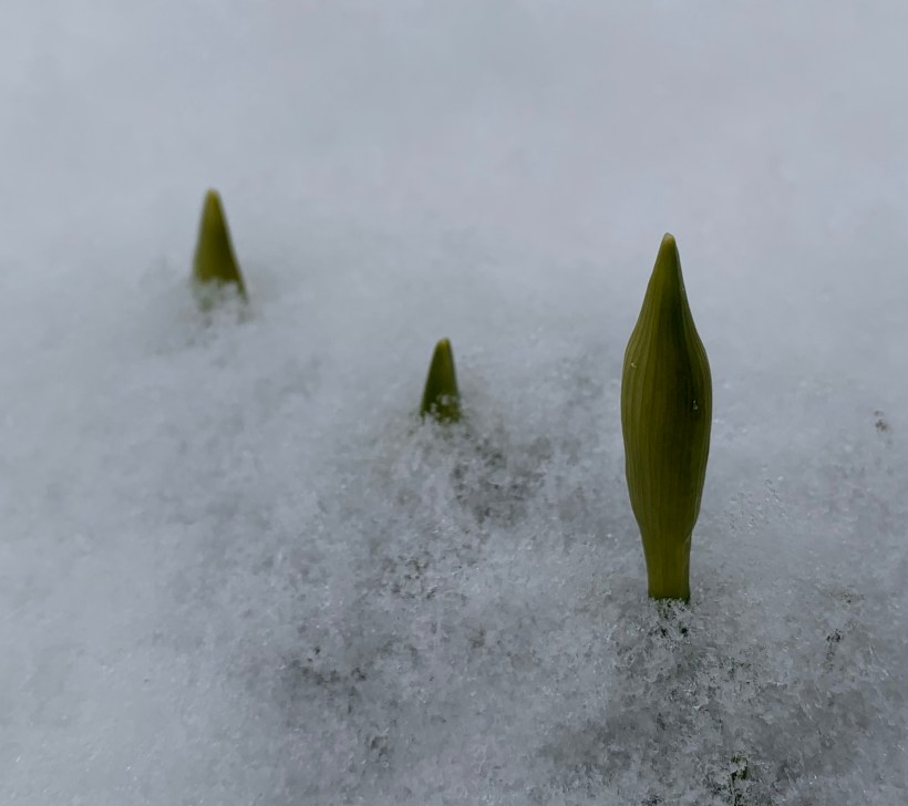 They are very tender, easily injured by a strong wind or late snowfall – mostly an old antique variety of fluffy double blooms, but some traditional trumpet blossoms still come up called forth by the trumpeting of the geese and swans passing over far above them.