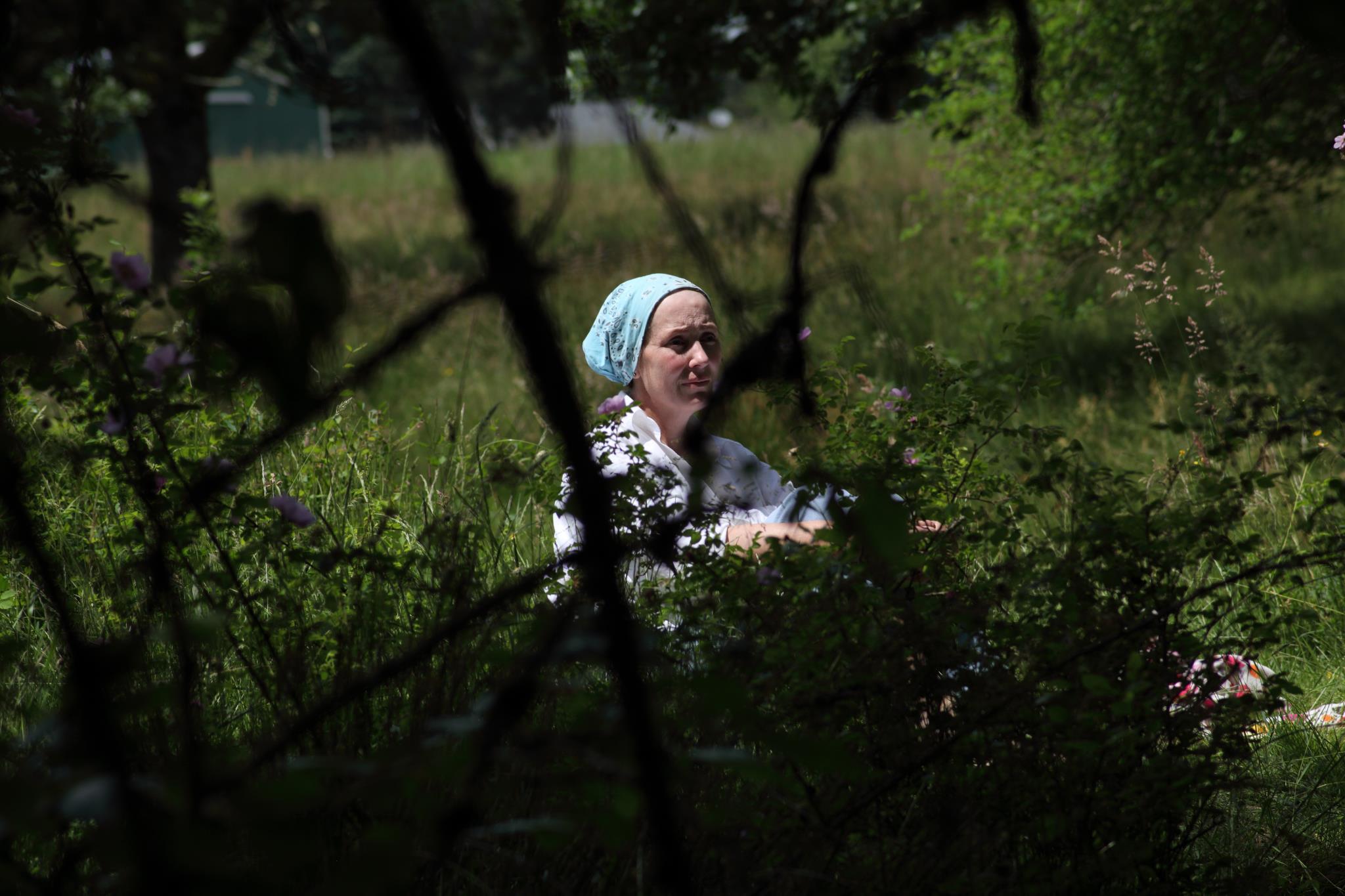 is picking blackberries in the shade.