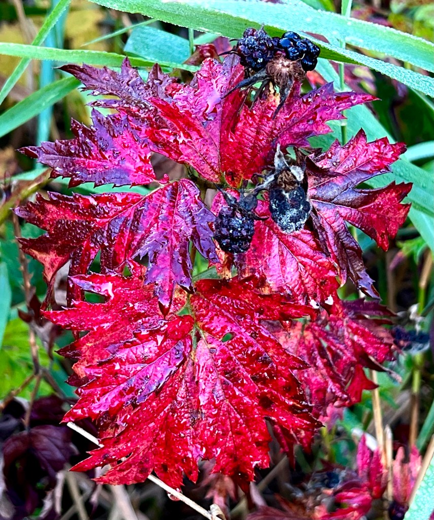 The blackberries gleam like glass,