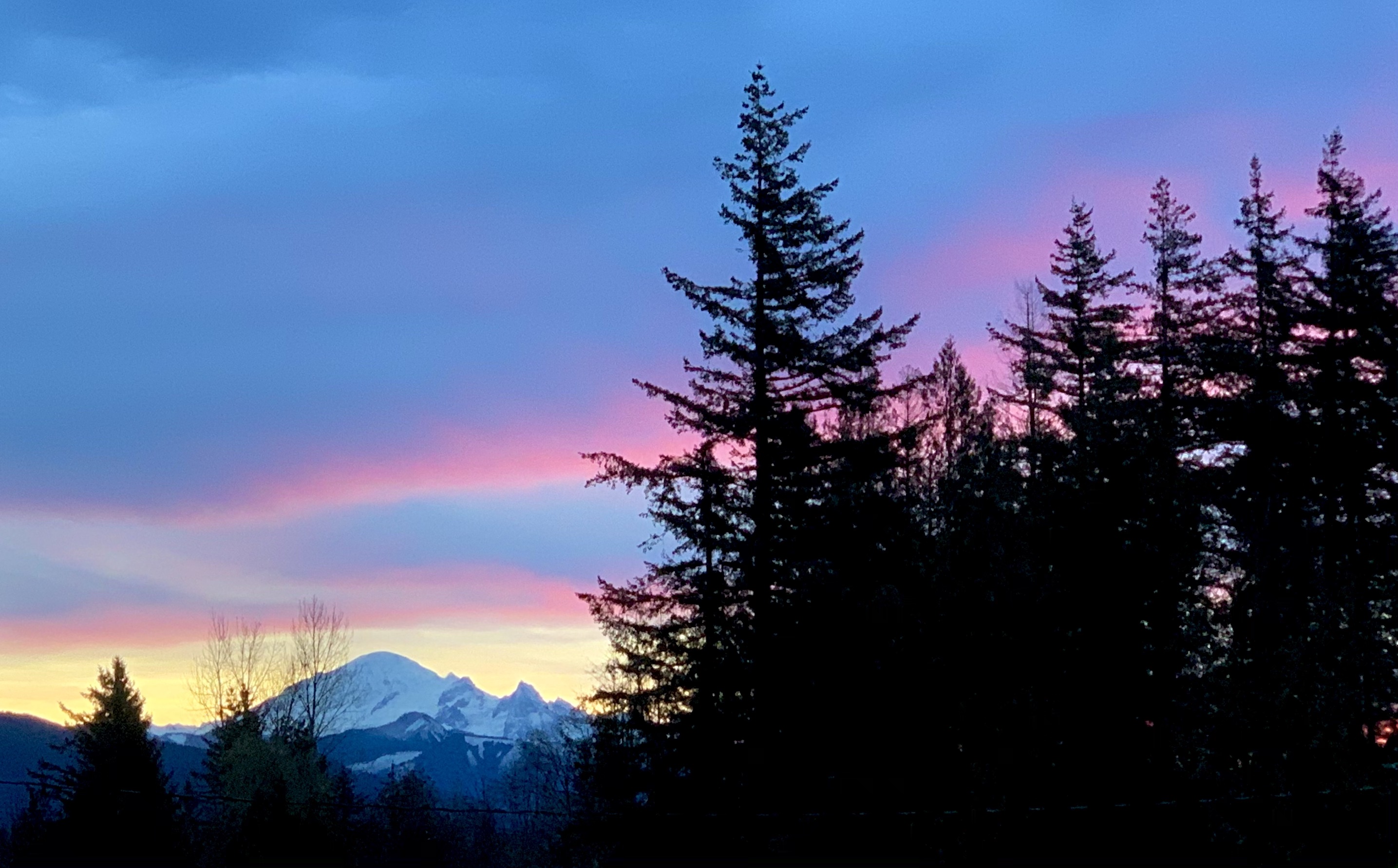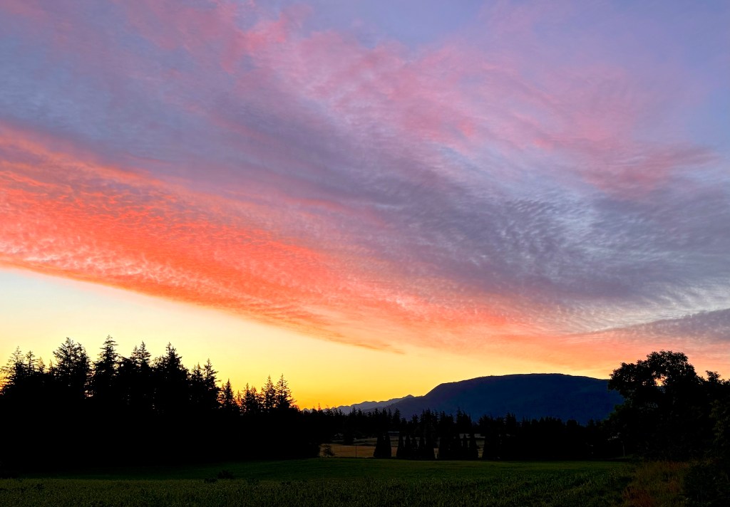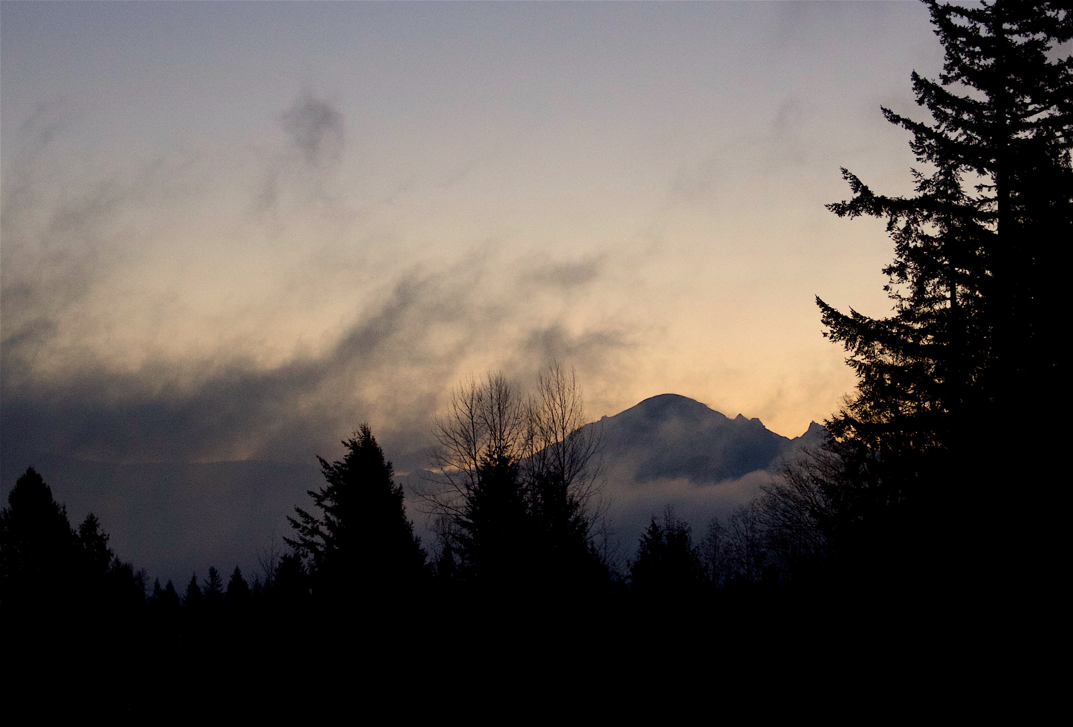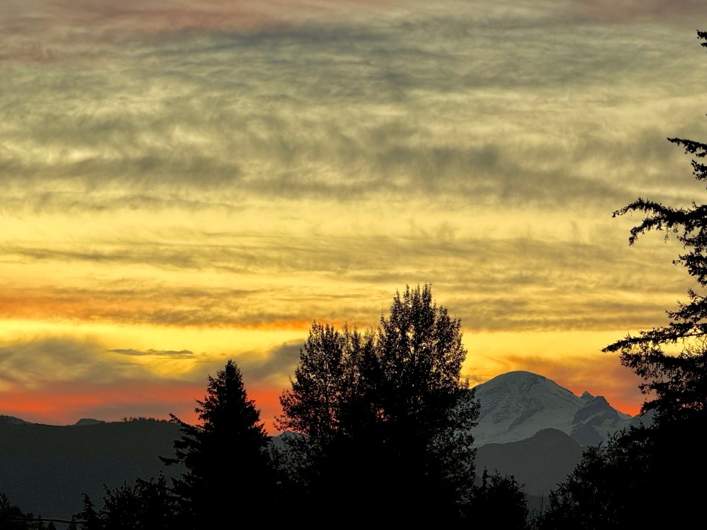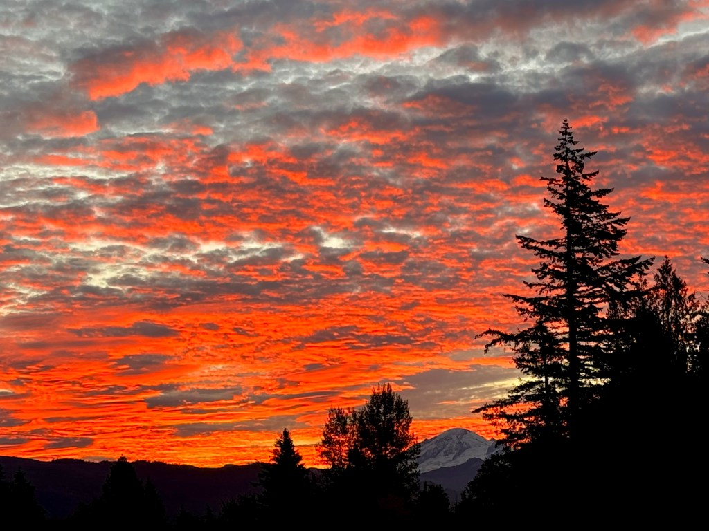 Then color appears, erasing all doubt: the hills begin to glow orange along their crest, as if a flame is ignited and is spreading down a wick. Ultimately the explosion of Light occurs, spreading the orange pink palette unto the clouds above, climbing high to bathe the glaciers of Mount Baker and onto the peaks of the Twin Sisters.