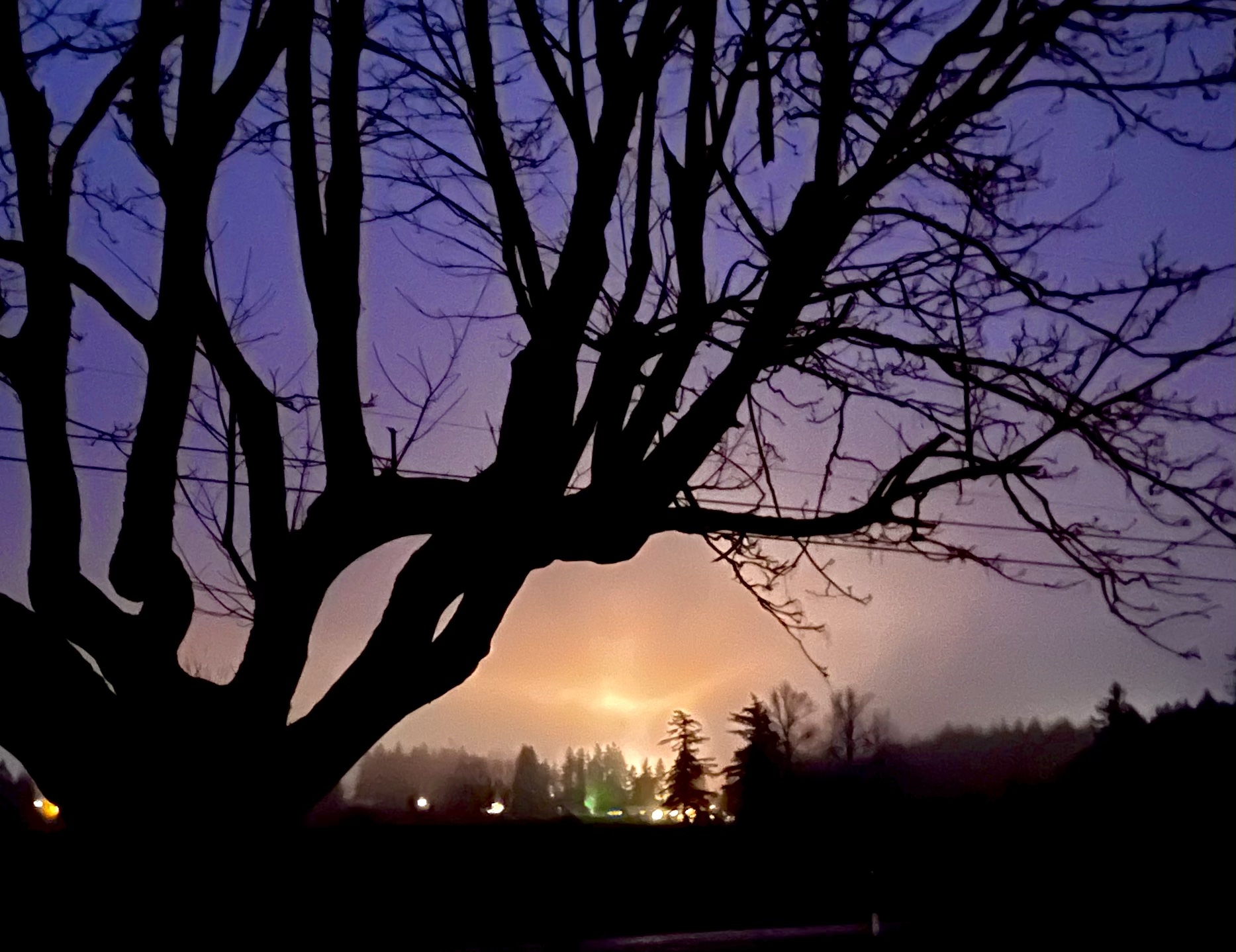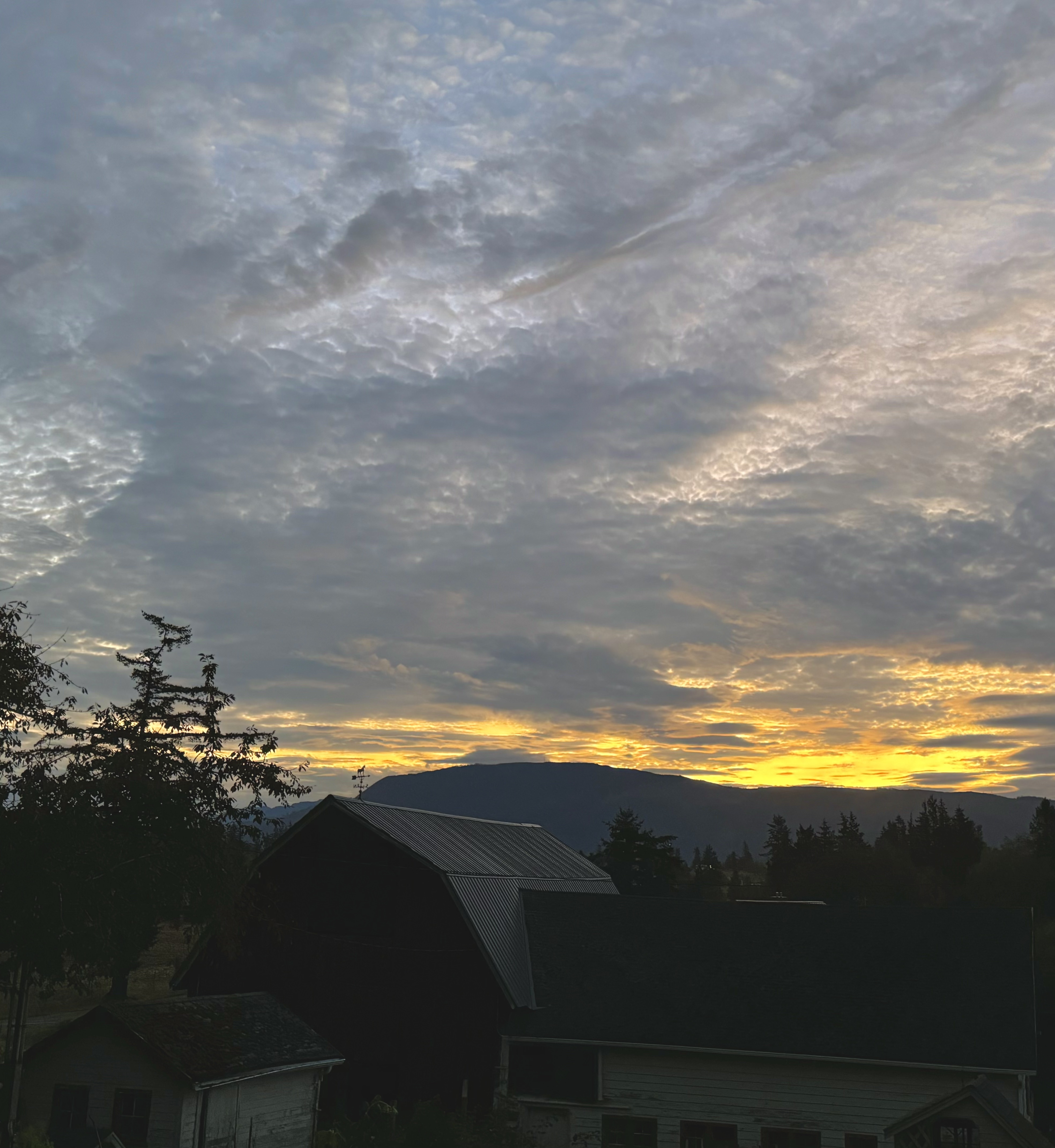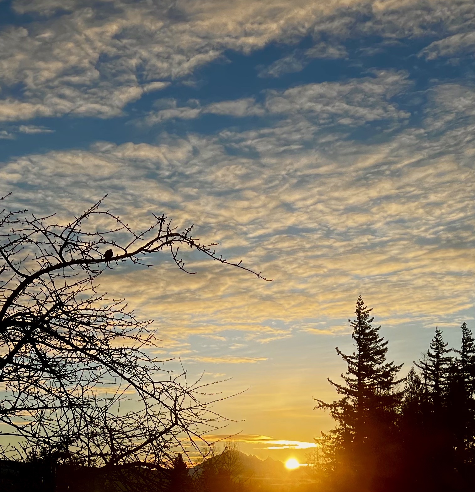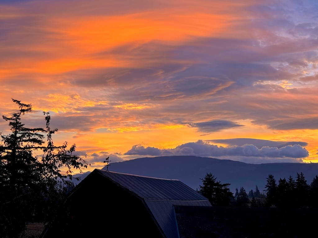 Then color appears, erasing all doubt: the hills begin to glow orange along their crest, as if a flame is ignited and is spreading down a wick. Ultimately the explosion of Light occurs, spreading the orange pink palette unto the clouds above, climbing high to bathe the glaciers of Mount Baker and onto the peaks of the Twin Sisters.