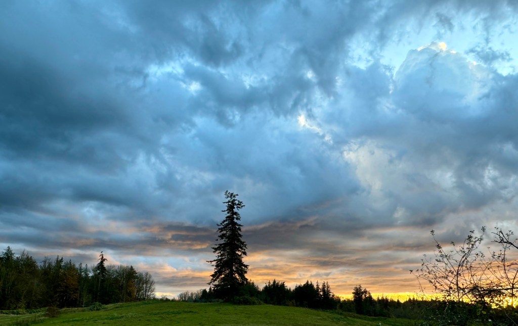 Every morning, cup of coffee in hand, I look out at the mountain. Ordinarily it’s blue, but today it’s the color of an eggplant.