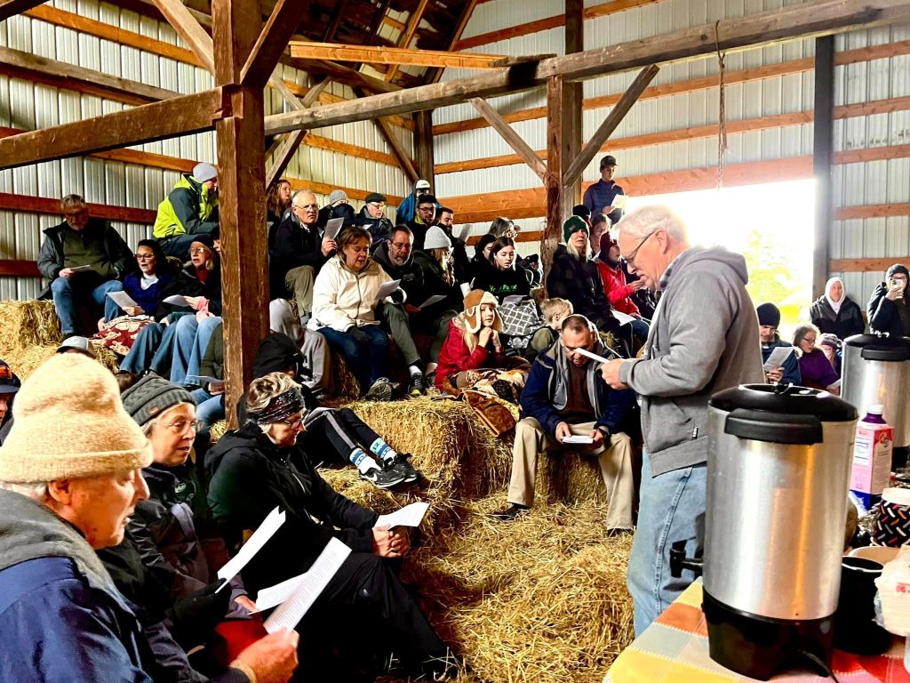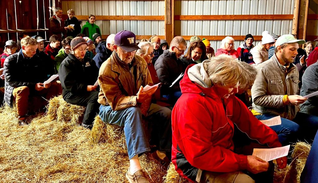 At our annual Easter Sunrise Service in Whatcom County starting at 7 AM, we develop a different Easter theme each year through use of scripture readings and songs, led by Dan Gibson. We sit on hay bales on the hill for the worship service, followed by breakfast of cinnamon rolls, hot chocolate and coffee. As many of the people who attend come from some distance from all over the county, we try to conclude by 8 AM so they may have time to get to morning church services.