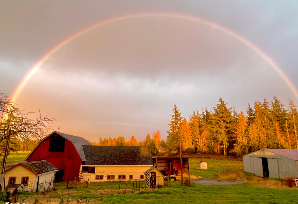 (Please park in the fenced arena to the right of the driveway and walk up to the lone tall fir tree on the hill directly behind our farm. If you have mobility issues, you are welcome to drive up to be dropped off and picked up later on the hill but please park below by the house.)
