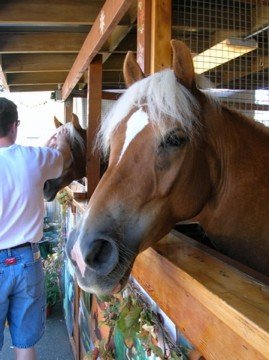 Next year, they were back, and Gary was a little taller, but still a quiet boy, and he kept dragging his mom back to the Haflingers, and she’d sit and visit as he’d sit on the Haflingers. He watched as we watered the horses, or fed them hay, or cleaned their stalls, and pretty soon he was asking if he could do the scooping, or dump the buckets or brush the horses. So he became, out of his own initiative, a helper.
