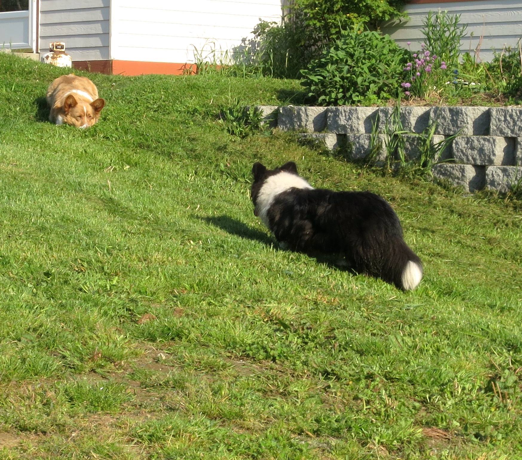 Sam waiting for HomerSam getting in positionHomer approaches – their eyes lockA little closerLet the game begin!