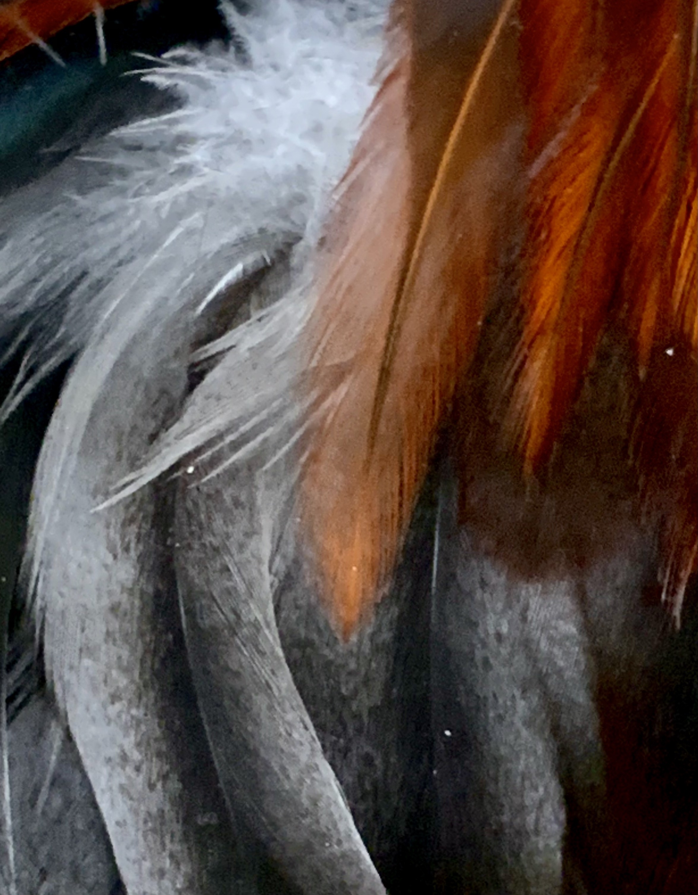 of winter-coming in her mane or the sound of winter-leaving in her mane—— yes, that sound——a liquid shushing like the blood-fill of stallion desire she knew once but crisper, a dry crinkle of fall leaves. Yes, that sound, as they fill their new wings then lumber to the canopy to demand come here, come here, come here, now come.