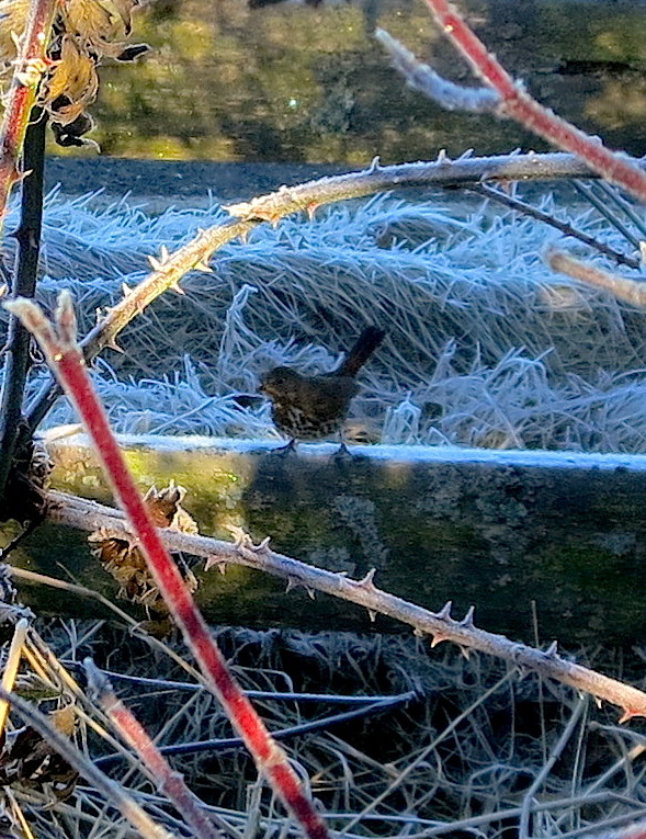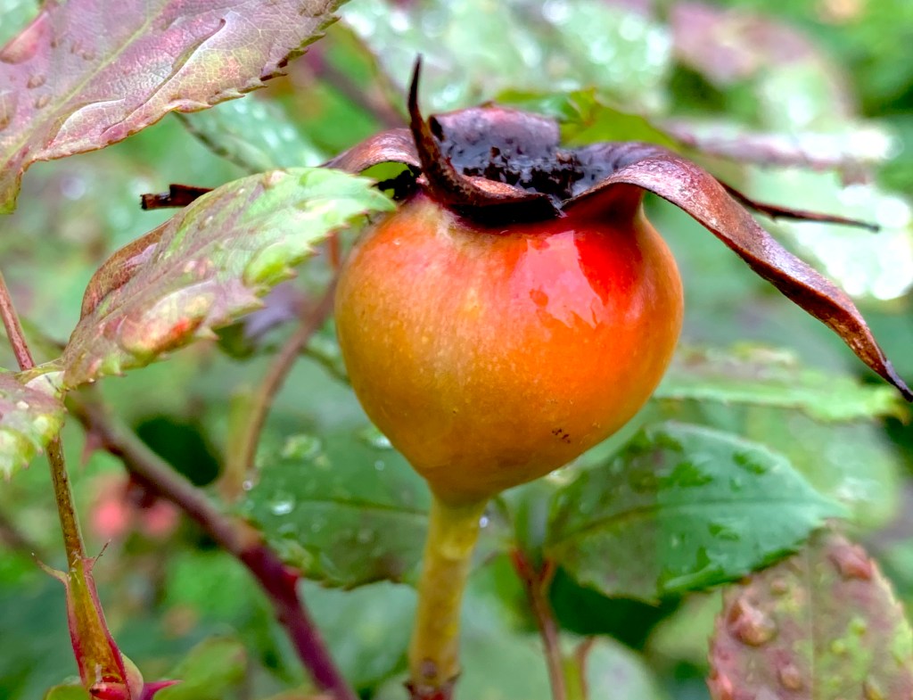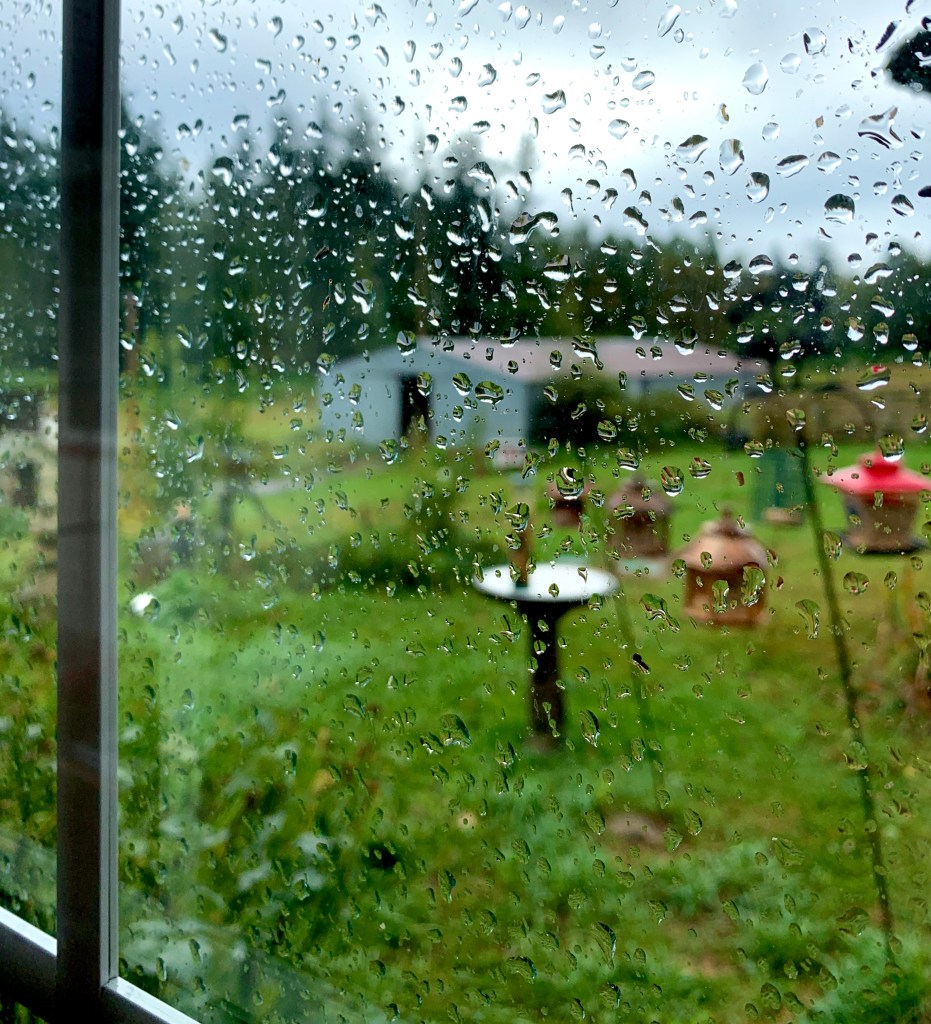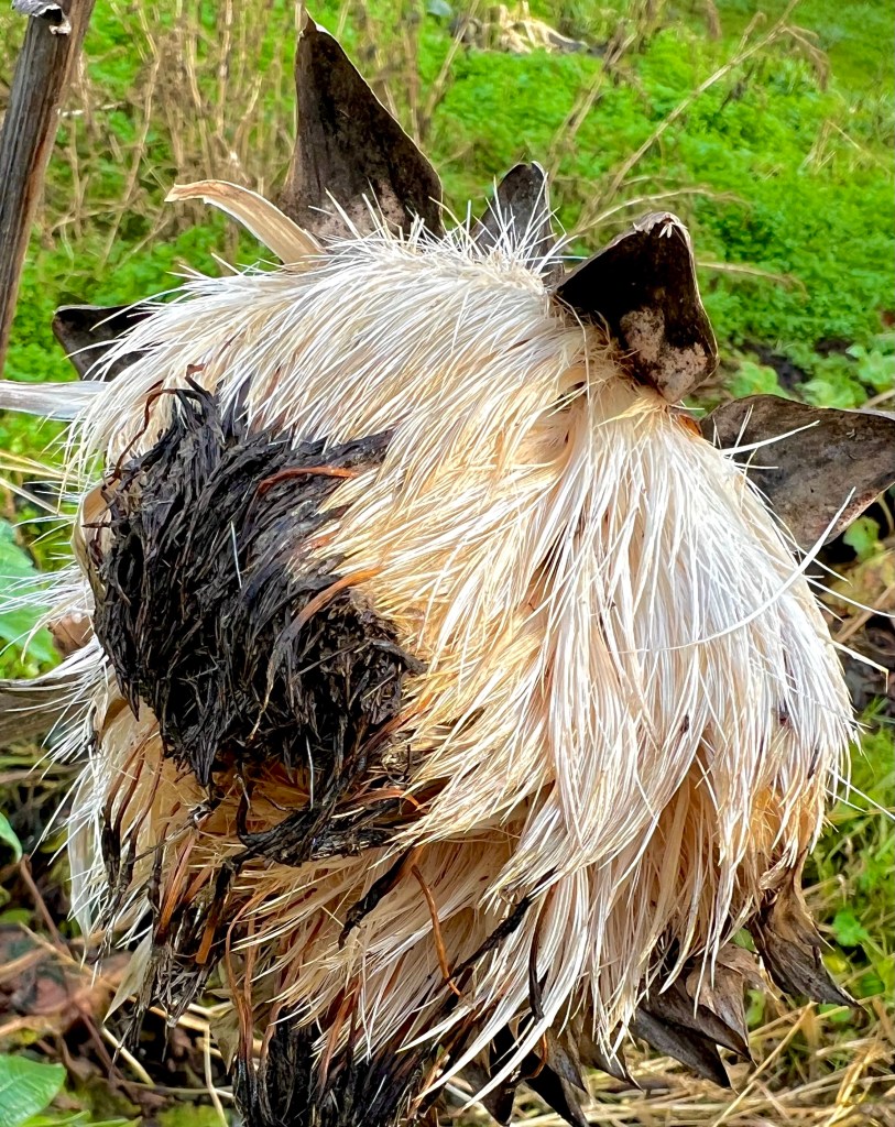 Even in the cold wet chill of November, our garden continues breathing, guarded by the furry fellow on a stalk below until a heavy windstorm topples him over.