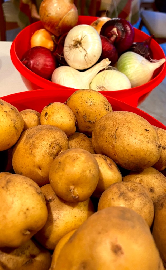 Down cellar: potatoes, carrots,