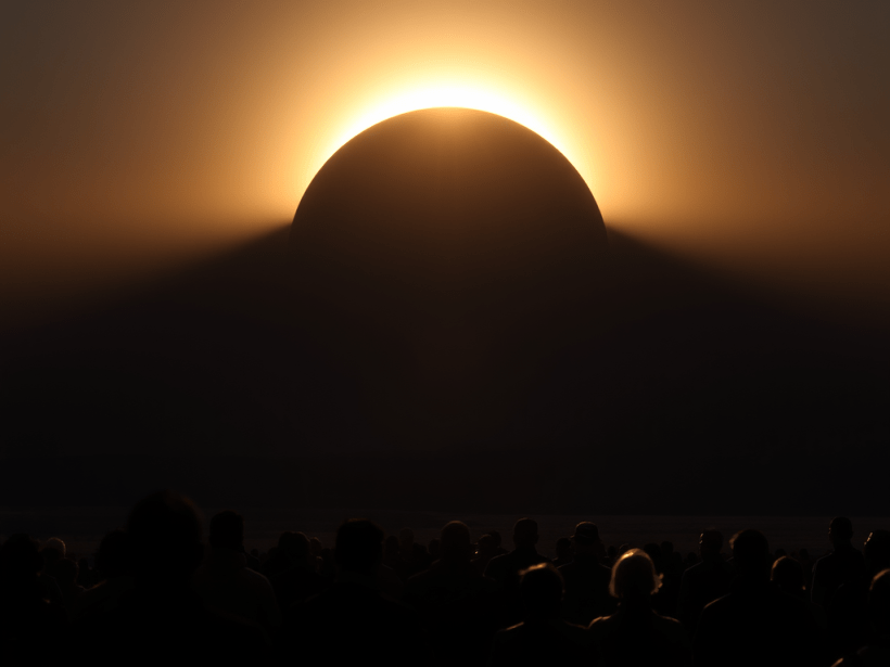 Less than two minutes later, when the sun emerged, the trailing edge of the shadow cone sped away. It coursed down our hill and raced eastward over the plain, faster than the eye could believe; it swept over the plain and dropped over the planet’s rim in a twinkling. It had clobbered us, and now it roared away. We blinked in the light. It was as though an enormous, loping god in the sky had reached down and slapped the Earth’s face.