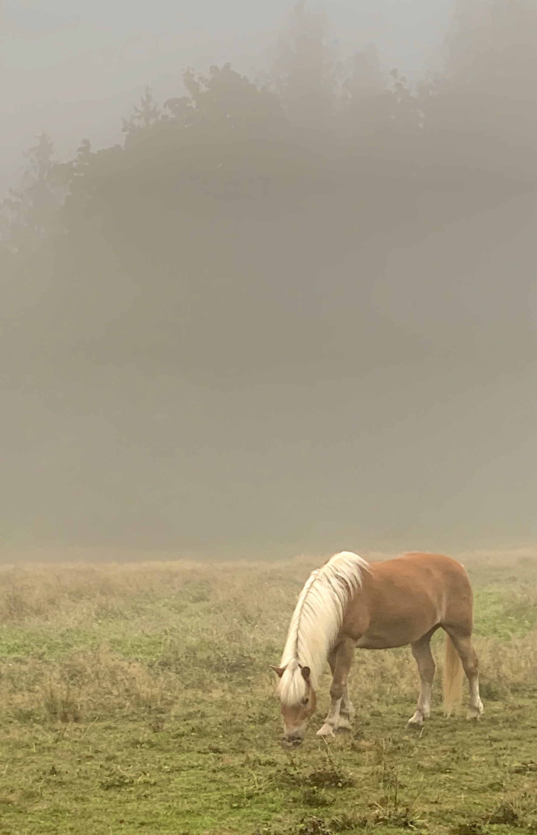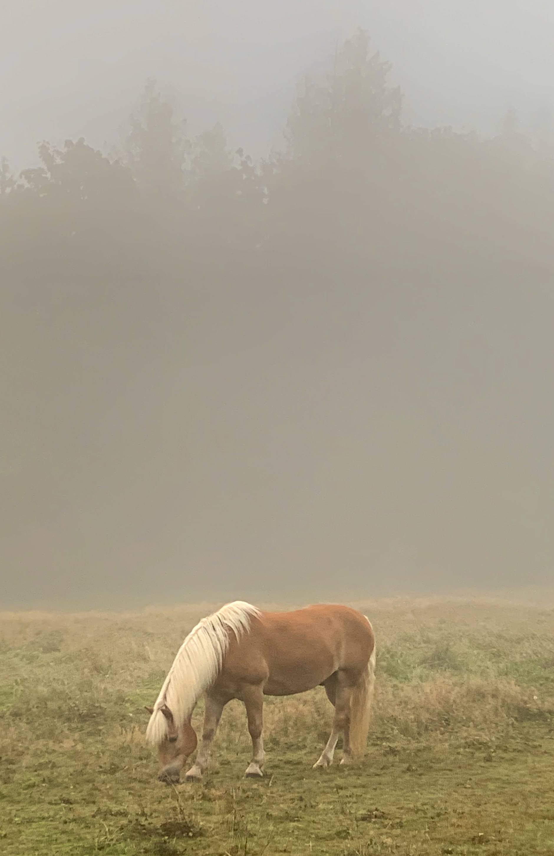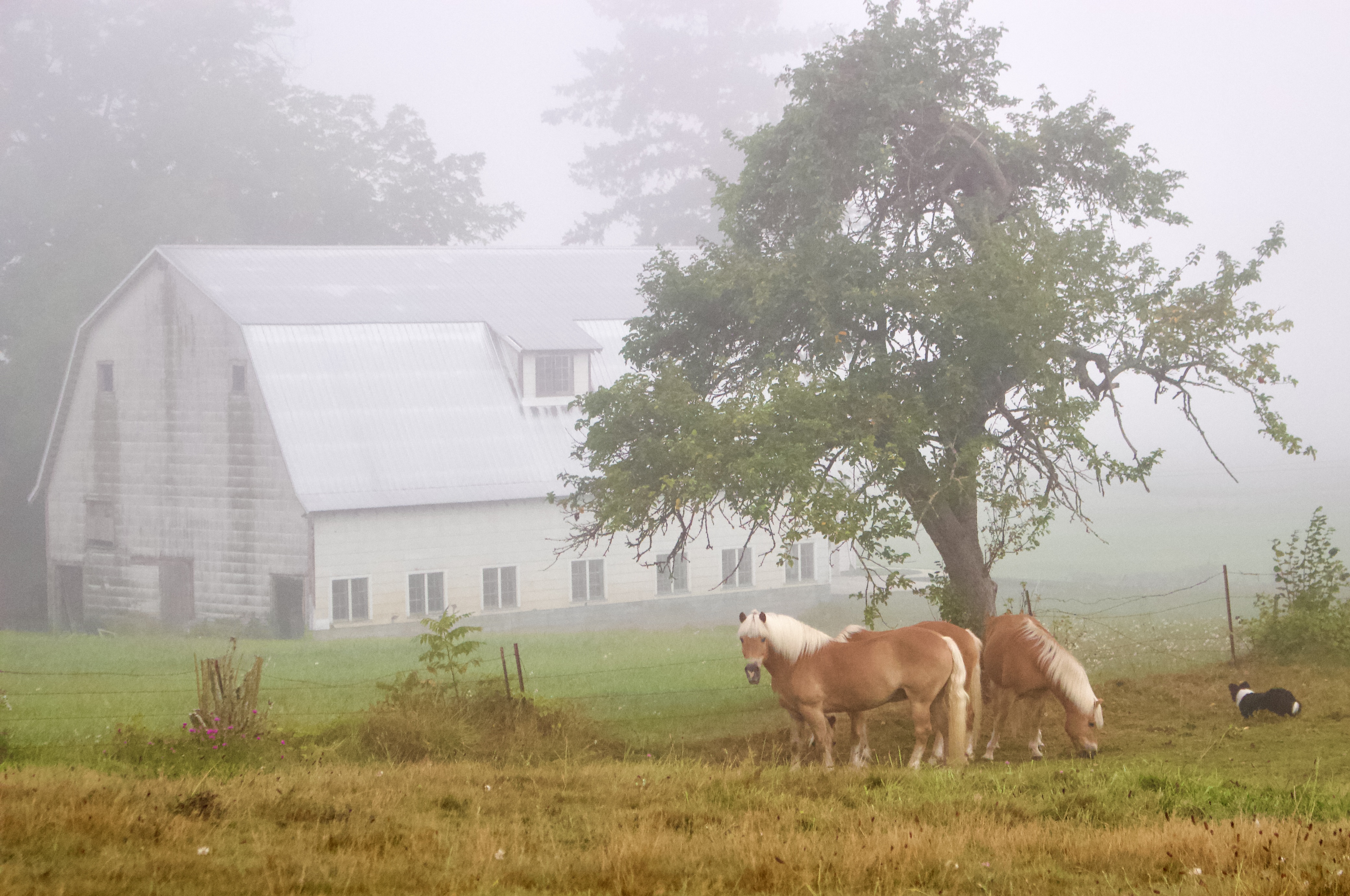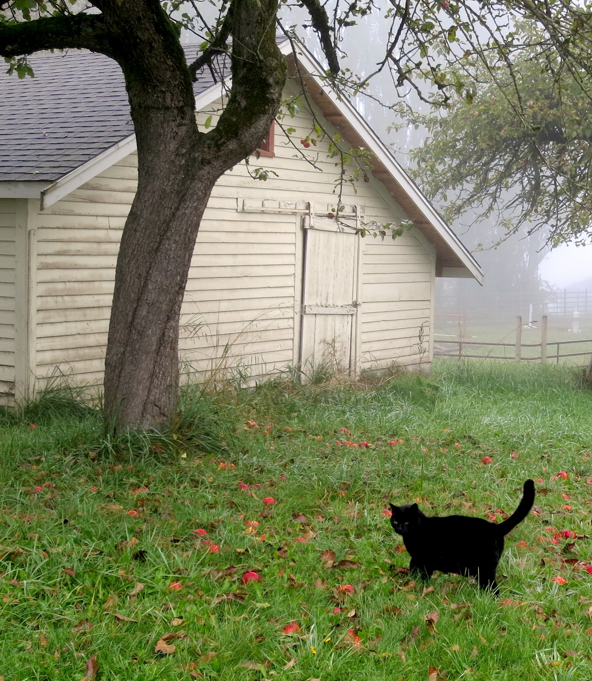 On the second day of fog, she goes to meet it sits on the broad root of a broken down apple tree, remembers being a child in such fog, searching for fairy houses. She hears movement in the grass, keeps very still while the veil of haze rises to treetops bronzed by the burn of the sun. Slowly horses and deer appear all around her, they graze close together, nosing fallen apples, until she forgets this is still a fallen world. ~Lonnie Hull DuPont, “On the Second Day of Fog” from She Calls the Moon by Its Name