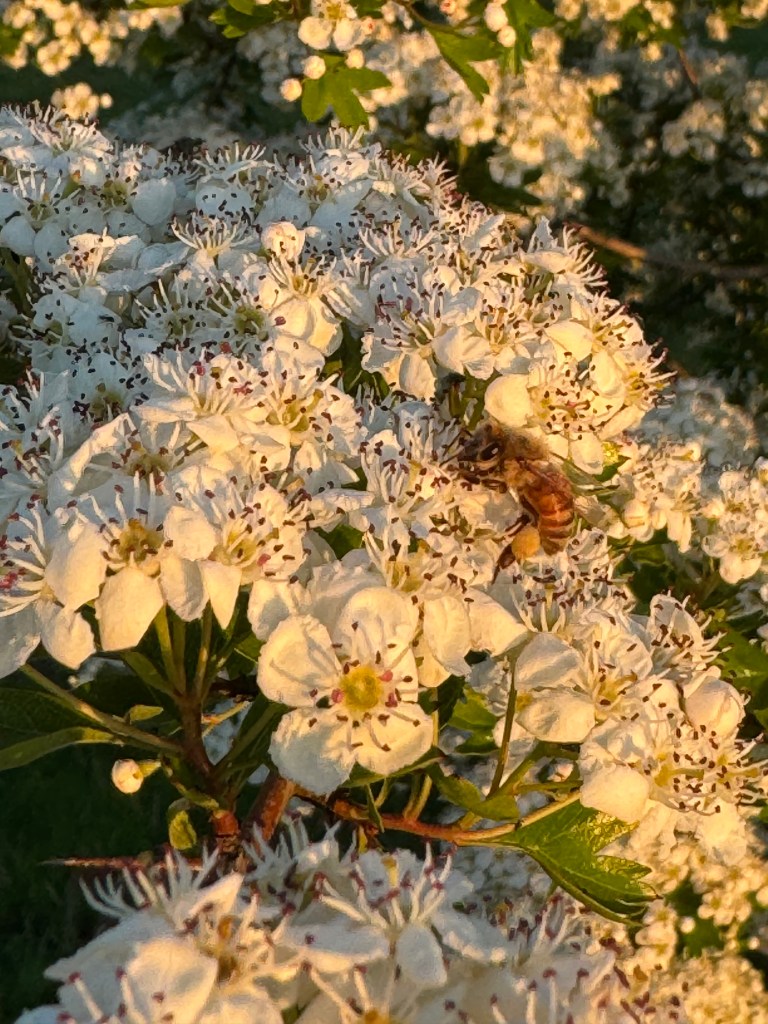 Followed a bee where apples blew like snow;