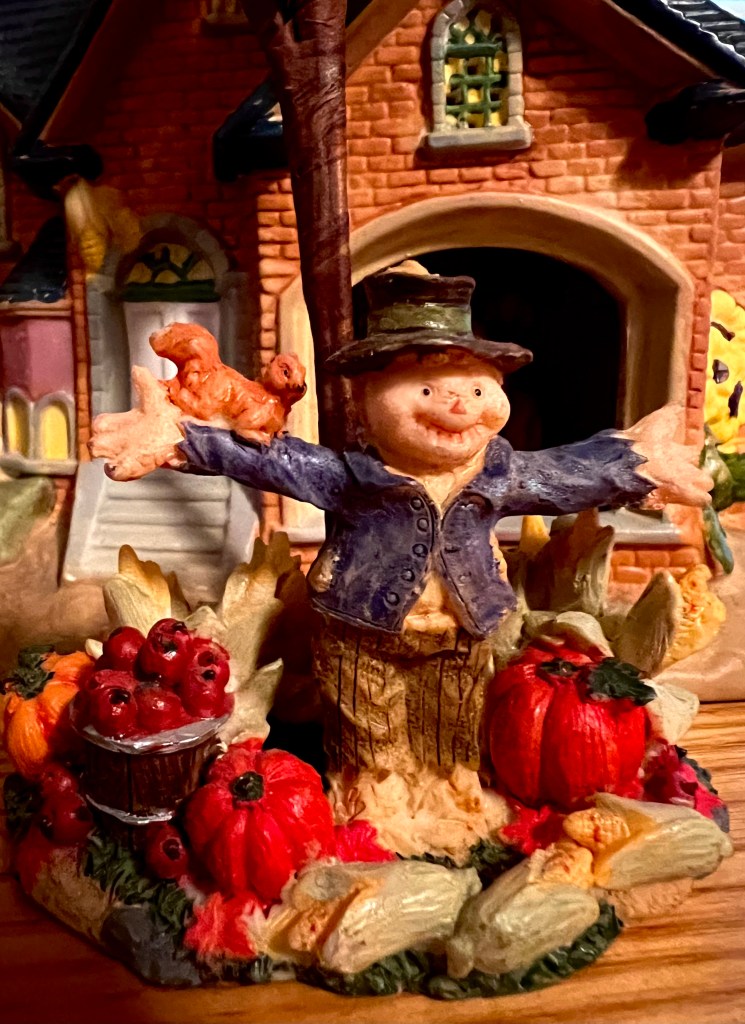 We don’t see many real working scarecrows around anymore. Corn and grain fields are so vast and abundant, the loss of a few kernels to raccoons or crows is not devastating to the farmer, so why frighten them away?