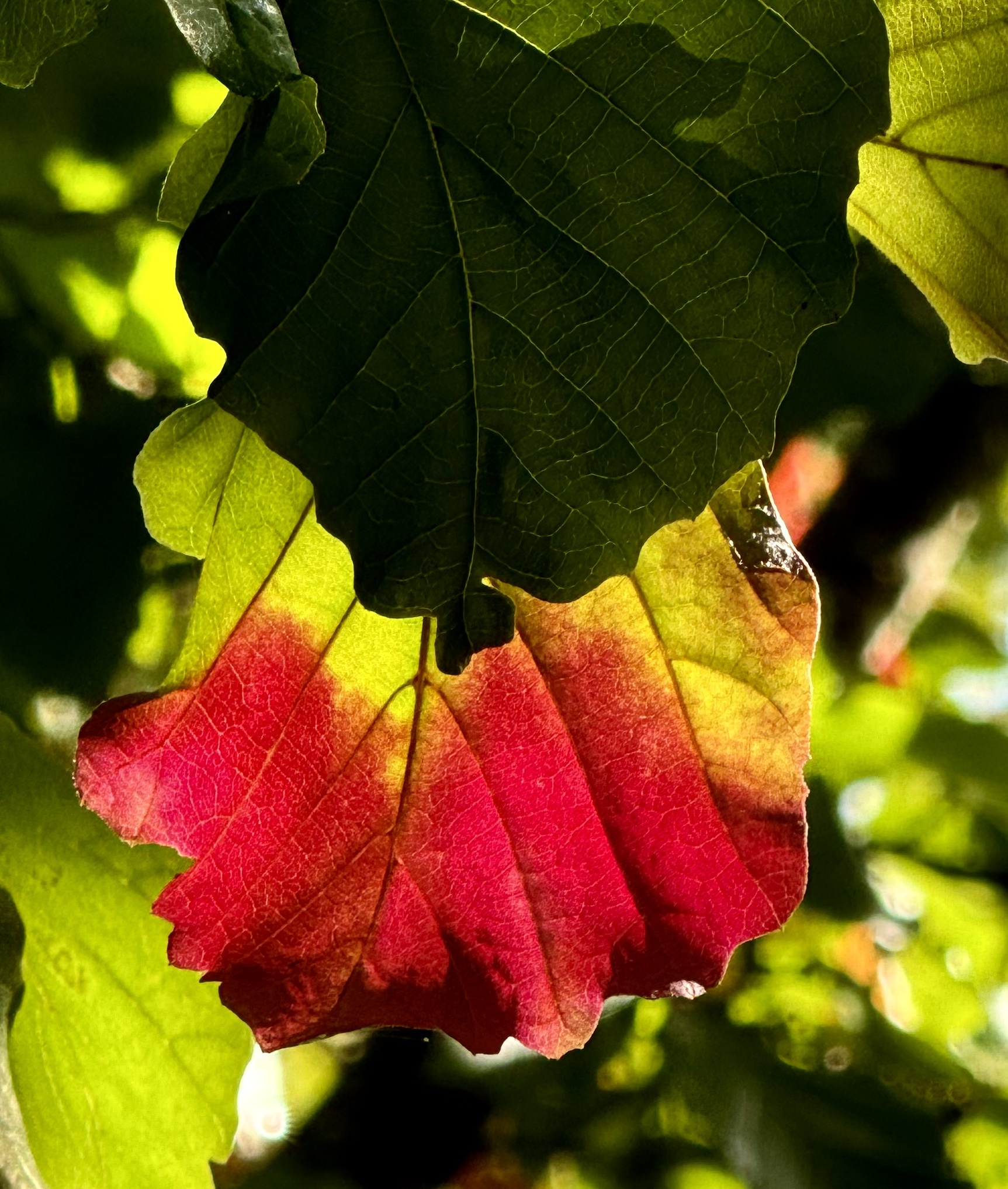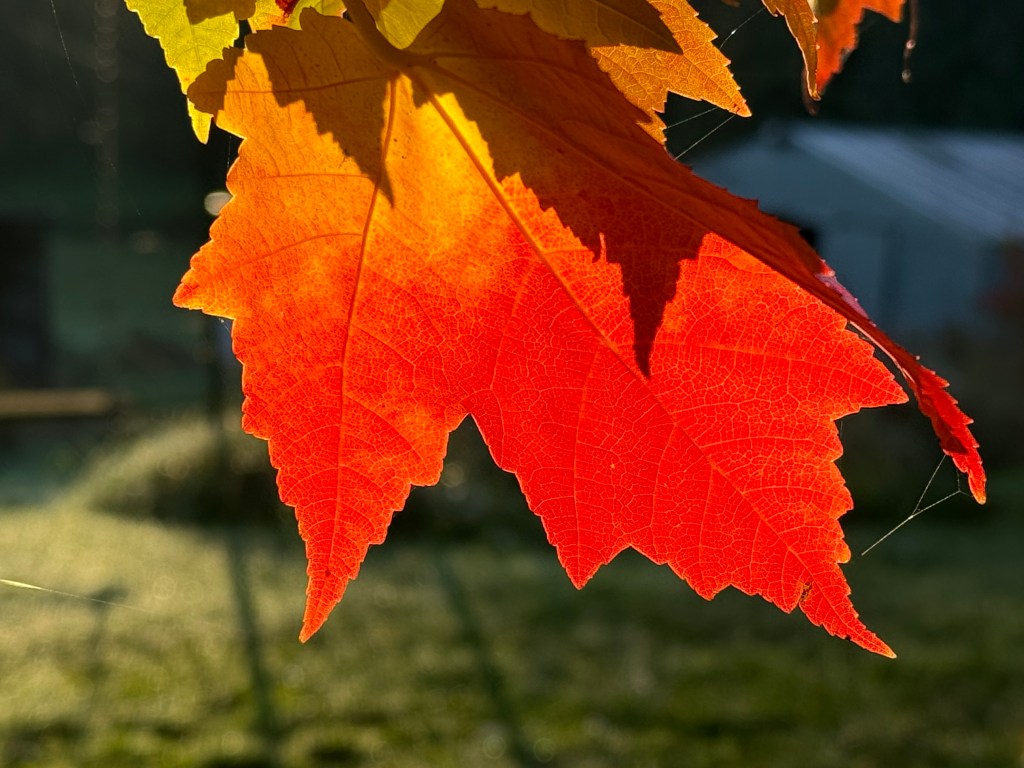 Of course I reach out and touch a leaf lit like fire though cool on the surface, the flame for show only