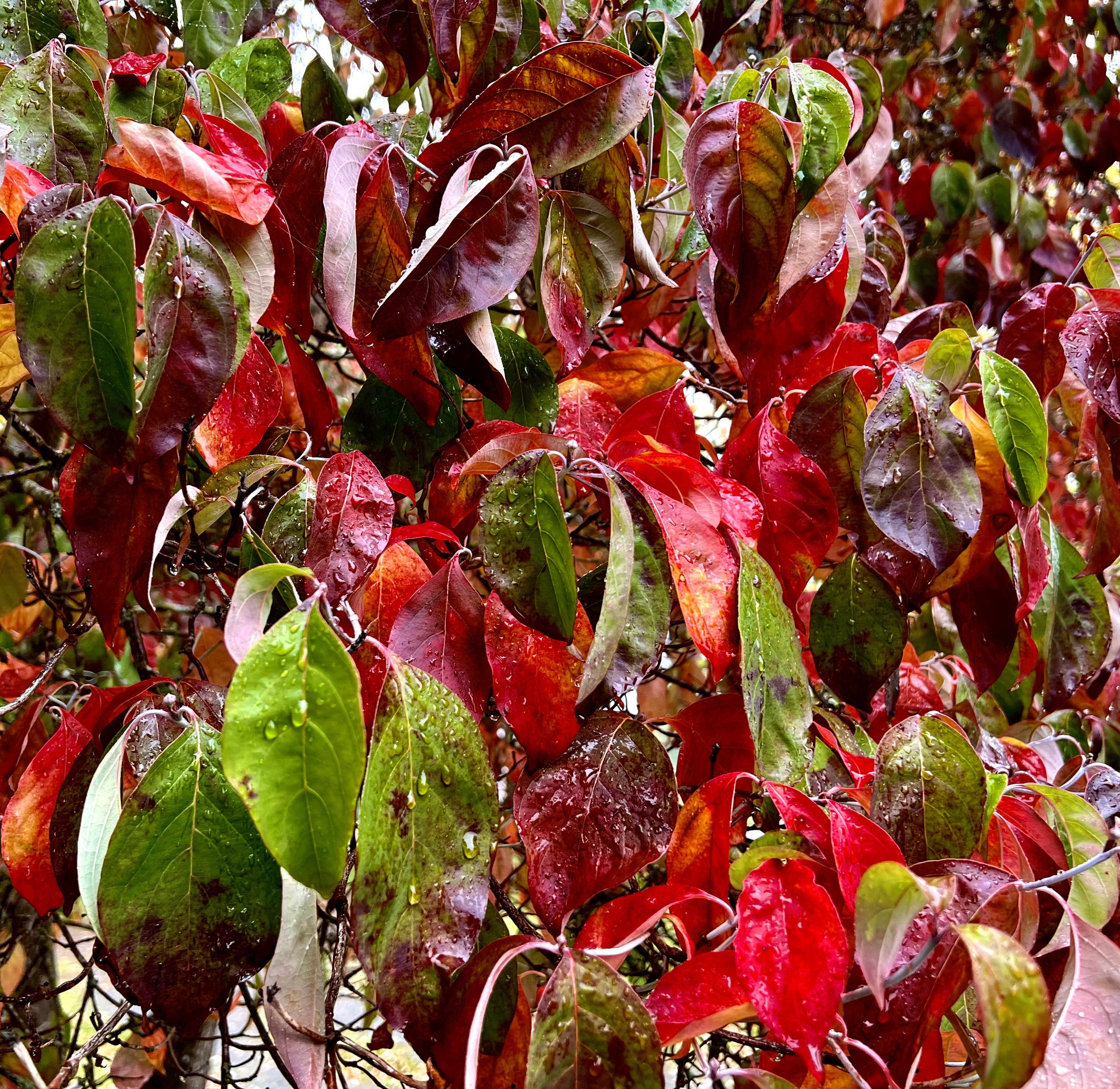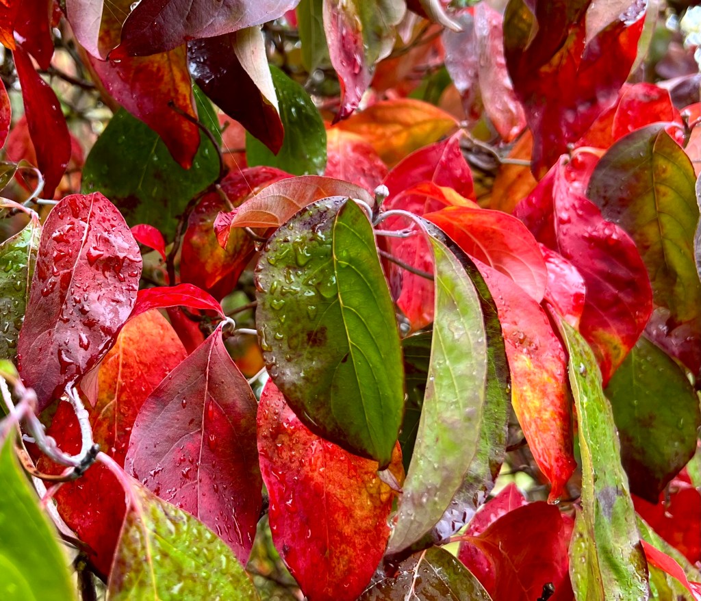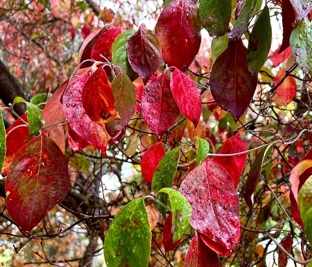 These mornings I wander stunned by light and mist to see trees tremble inside their loosening cloaks, a pulsing palette of color ready to detach, revealing mere bones and branches.