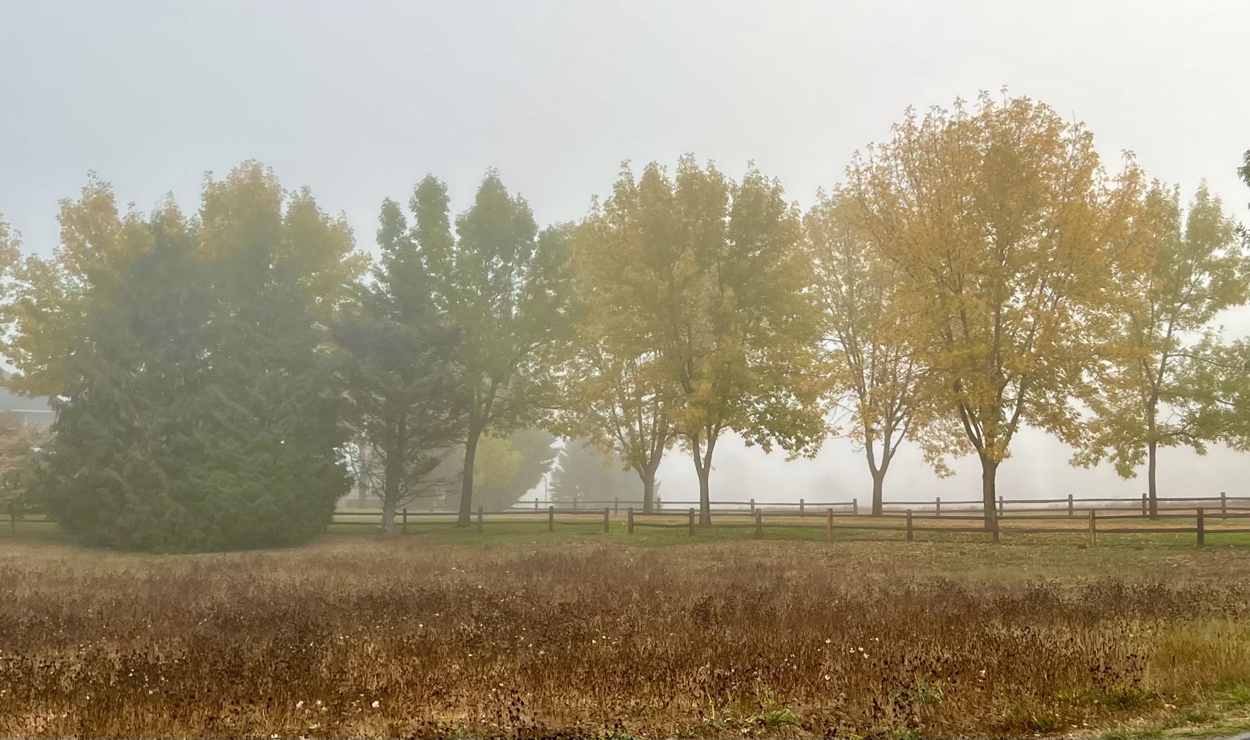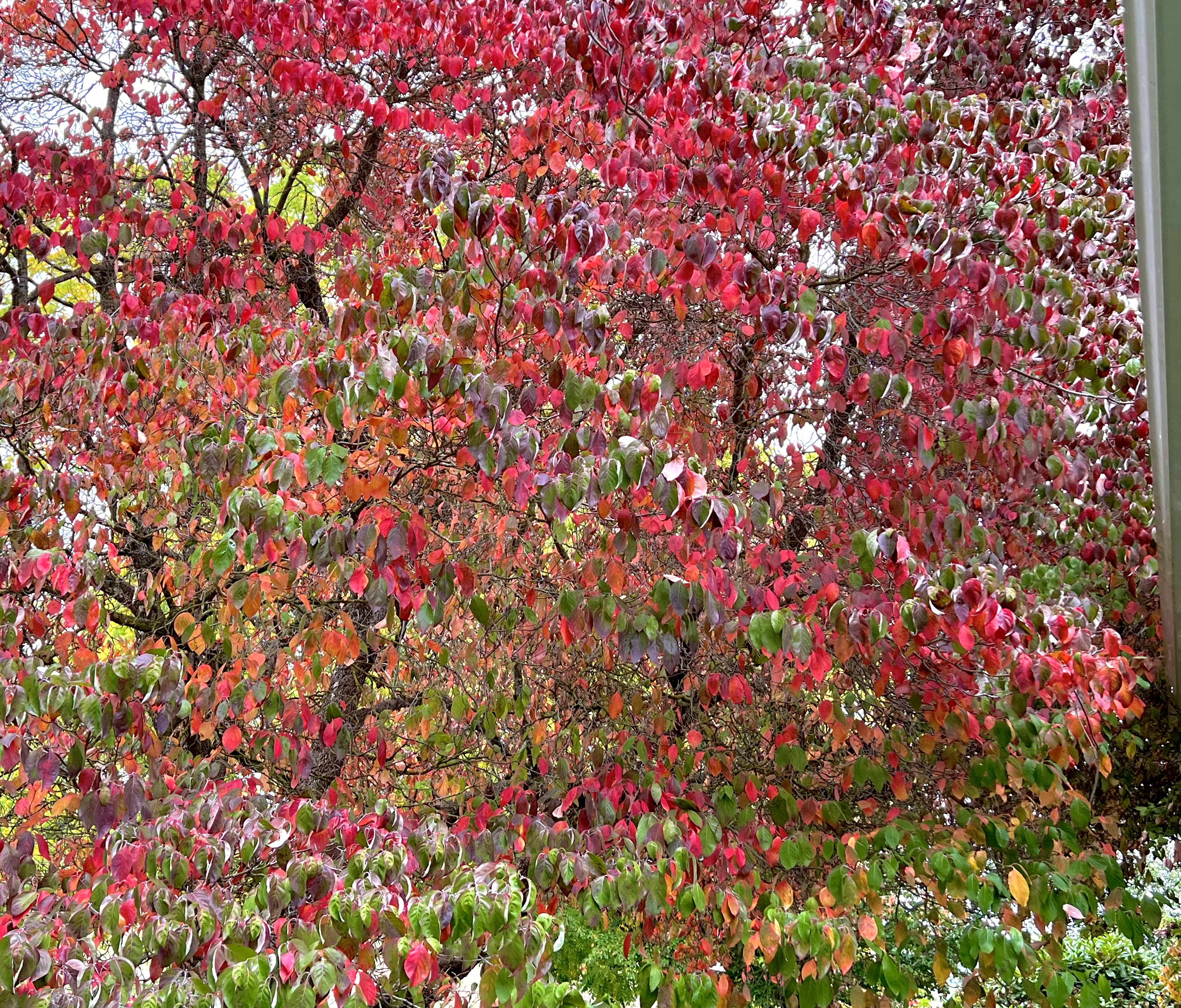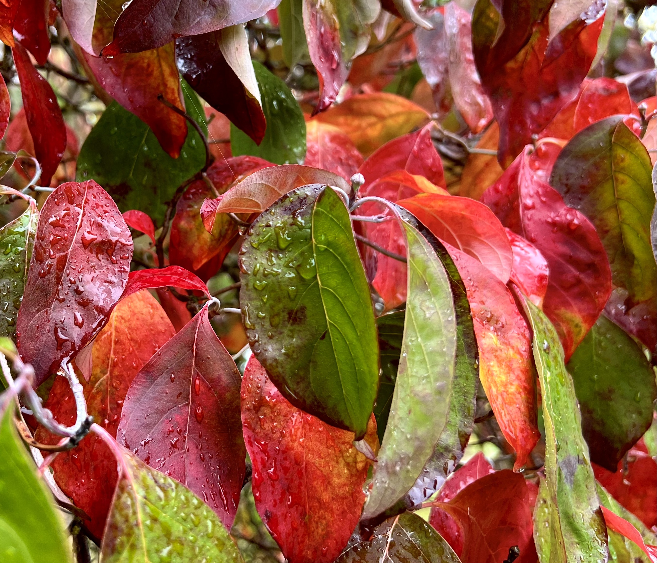 These mornings I wander stunned by light and mist to see trees tremble inside their loosening cloaks, a pulsing palette of color ready to detach, revealing mere bones and branches.
