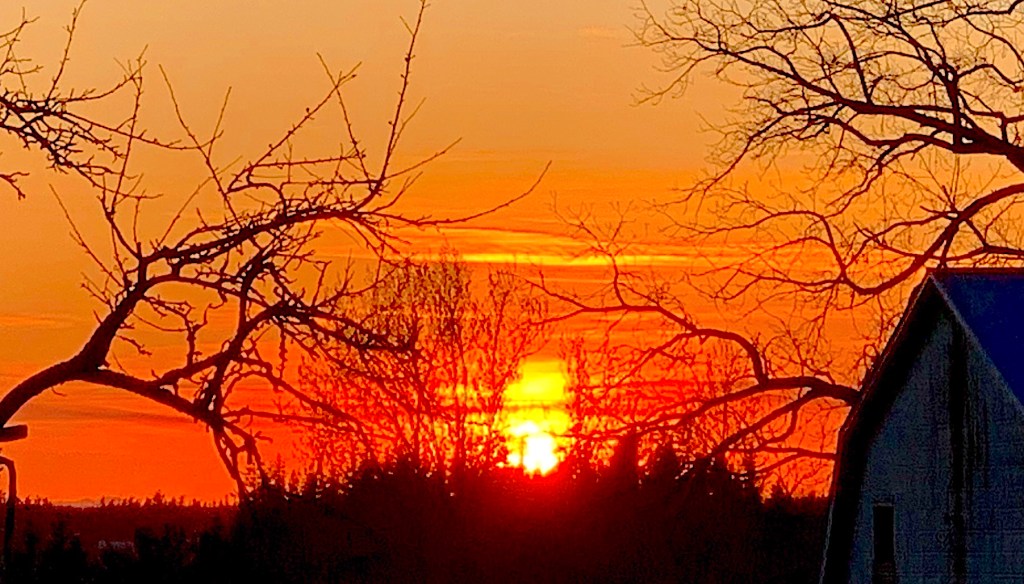 Yet the sunset becomes a startling send-off for fall, coloring Mt. Baker and surrounding an almost full moon with purple in the eastern sky. Our farm, for a deceptive few minutes, appears rosy and warm in crisp subfreezing weather. Then all becomes gray again, and within an hour we are shrouded in thick fog which ices the asphalt as darkness fell.  It becomes a challenge to avoid the deep ditches along our country roads, with the white fog line being the critical marker preventing potential disaster.